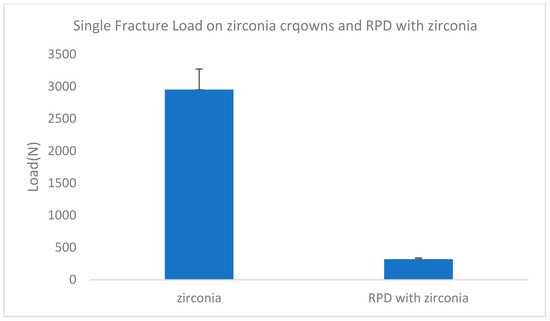 The mean fracture strength of zirconia crowns from the previous research [34] was significantly higher than that of RPD saddles with zirconia crowns in this study (p ≤ 0.05) (Table 3 and Figure 8)
