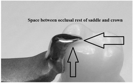 One factor that affects fracture test performance is the firmly located samples in the testing machine during the test. One of the IPS e.max Press crowns failed the test due to the improbably located occlusal rest, which led to the move and sliding of the RPD saddle during the test. That was not expected, as all samples were designed and fabricated using CAD/CAM. It was assumed that the RPD saddles would be accurate enough to obtain acceptable results. This assumption was related to the findings of a previous study, indicating that the adaptation of CAD/CAM fabricated dentures would be more accurate compared to the conventional methods [39]. It is worth mentioning that this was only noticed with one sample with IPS e.max crowns. This might be due to the fabrication process of the IPS e.max crowns via CAD/CAM producing wax crowns then pressed as the ceramic crown, or the excessive use of a glazing agent, which changed the dimension and geometrical shape of the fossa, occlusal rest or crown, causing improbable fitting of the RPD rest and saddle (Figure 11). Moreover, using a saddle with only an occlusal rest could be another drawback of the samples and study, as other components can improve denture retention and stability, such as the clasp or connectors.