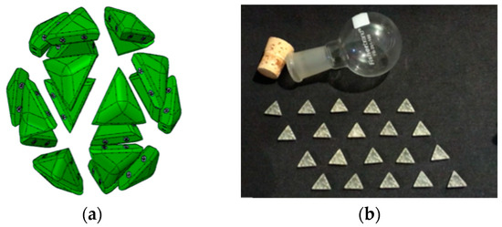 First, we [27] constructed a self-assembling icosahedron (Figure 9; Supplemental Movie S1). We use a Schlegel diagram (Figure 10) to construct a topological model of where to place the magnets so that all identical subunits align and bind. As was previously done with Olson’s dodecahedron model [22,24,25,26], by reversing the location of north and south poles of all of our magnets, we can construct two different enantiomers of the self-assembling icosahedron. See Tibbits [11] (pp. 80–82) for a similar experiment with two different enantiomers of the self-assembling dodecahedron.