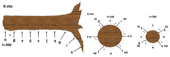 Left: a schematic illustration of the xilematic bioelectric potential recording of site from a healthy tree (rotated counterclockwise). Right: the floematic bioelectric potential recording of site from a healthy tree. Here, we show two sections at different heights from the ground. The numbers indicate distances in centimetres, with relevant coordinates specified as N = North, S = South, E = East, W = West, NE = North-East, SE = South-East, NW = North-West, and SW = South-West.