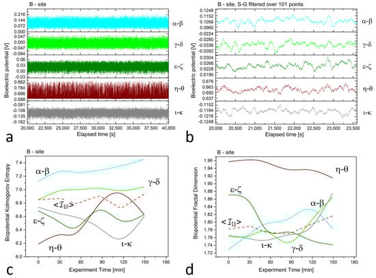 (a) Raw recordings from five differential floematic channels situated along the trunk of a young, healthy tree, captured over a 20,000 second continuous recording. (b) The plot of 1 h of data after applying the first-order Savitzky–Golay smoothing function with a window of 101 points. (c) The Kolmogorov complexity of the bioelectric potential data collected during thermographic data acquisition. All channels are presented along with their average (the dashed red curve). (d) The fractal dimension of the bioelectric potential data collected during thermographic data acquisition. All channels are presented along with their average (the dashed red curve).