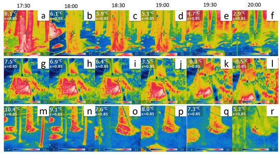(a–f) Thermographic images of the tree at Site ‘B’. (g–l) Thermographic images of one of the five logs at Site ‘E’. (m–r) Thermographic images of the tree at Site ‘G’. The temperature readings in the top-left inset of each plot are direct observations with a fixed emissivity from the pixel indicated by the middle cross. The actual time scale is also indicated.
