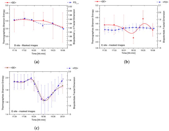 Our study utilised thermographic imaging and bioelectric potential recordings at three sites as shown in Figure 5. The data was synchronised in time, and complexity analysis was performed to produce comparable results. After registering and masking each frame, the Shannon entropy was calculated and compared with the fractal dimension of electrical signals as shown in Figure 6.