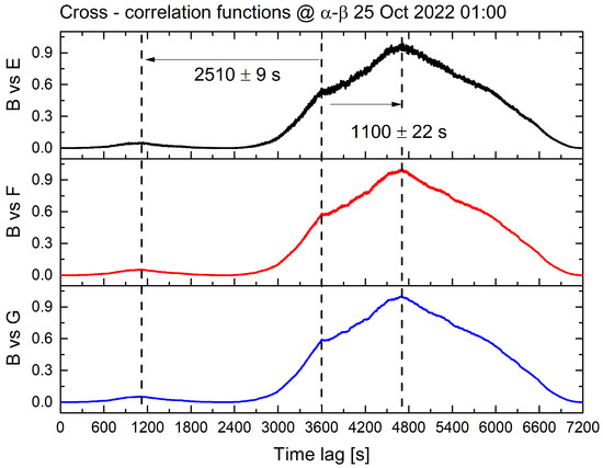 The results of a quadratic cross-correlation analysis on biopotential signals collected from all sites, with a data chunk of 1 h. The biopotential vectors from site ‘B’ were compared to those from sites ‘E’, ‘F’, and ‘G’ to investigate temporal correlations. The cross-correlation functions for each comparison are represented by the black curve (site ‘B’ vs. site ‘E’), the red curve (site ‘B’ vs. site ‘F’), and the blue curve (site ‘B’ vs. site ‘G’), respectively. The similar shapes of the curves demonstrate the similarity in the behaviour of biopotential fluctuations across all comparisons. The time lag at which the cross-correlation reaches its absolute maximum is approximately 1100 s, and a relative maximum occurs at approximately double the time lag. The compared sites are located at about the same distance, approximately 16 m.