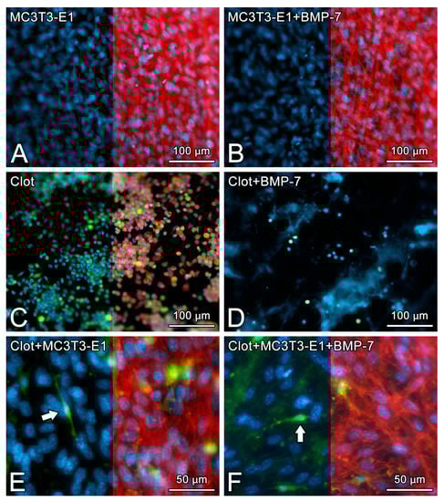 The epifluorescence of MC3T3-E1 cells on day 5 of culture (A,B), blood clot alone on time 0 (C,D), or the combination of both on day 5 of culture (E,F) on pristine Nano-Ti (A,C,E) or Nano-Ti functionalized with rmBMP-7 (B,D,F). Red fluorescence (Alexa Fluor 594 phalloidin) indicates the actin cytoskeleton (A–C,E,F), green fluorescence indicates the GFP-positive blood clot leukocytes (C–F), and blue fluorescence indicates the cell nuclei (DAPI nuclear stain) (A–F) and the fibrin network (D). Red fluorescence is deleted in the left halves of (A–C,E,F) using Adobe Photoshop CS6 for a better visualization of the cell nuclei and GFP-positive cells (white arrows in (E,F)) in the same microscopic field. Objectives: 20× (A–D); 40× (E,F).
