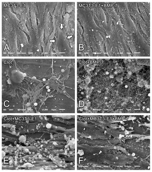 Scanning electron microscopy (SEM) imaging of MC3T3-E1 cells on day 5 of culture (A,B), blood clots alone on time 0 (C,D), or the combination of both on day 5 of culture (E,F) on pristine Nano-Ti (A,C,E) or Nano-Ti functionalized with rmBMP-7 (B,D,F). Original magnification: 1000× (A–F). MC3T3-E1 cells exhibit elongated shapes (white arrows in (A)) irrespective of the presence of a blood clot.