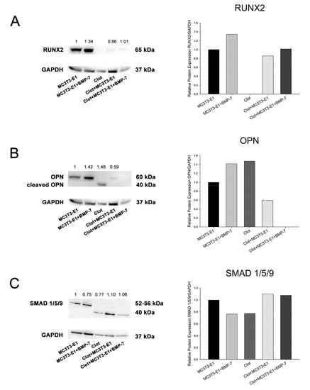 Briefly, the samples were processed in an ultrasonic bath (Misonix, Farmingdale, NY, USA) using a RIPA buffer. The total protein was quantified using the micro Lowry assay using the DC™ kit protein assay (Bio-Rad). Then, proteins were separated by SDS polyacrylamide gel electrophoresis (10%) and transferred to polyvinylidene difluoride (PVDF) membranes (Thermo Fisher Scientific). The membranes underwent the following incubations at RT: (1) 5% skimmed milk or BSA solution in TBS-T, according to the manufacturer’s recommendations; (2) primary monoclonal antibody anti-runt-related transcription factor 2 (RUNX2), 1:500 (#12556, Cell Signaling Technology Inc., Danvers, MA, USA); (3) primary anti-OPN monoclonal antibody MPIIIB10-1, 1:1000 (Hybridoma Bank, Iowa City, IA, USA); (4) primary polyclonal anti-phosphorylated suppressor of mothers against decapentaplegic (SMAD) 1/5/9 antibody, 1:1000 (#13820, Cell Signaling Technology Inc.); (5) primary polyclonal anti-GAPDH antibody, 1:1500 (sc-25778, Santa Cruz Biotechnology, Dallas, TX, USA). The membranes were analyzed in the G-Box (Syngene, Frederik, MD, USA). The number of band pixels was measured using GeneSys 1.6.9 (Syngene) and GeneTools 4.3.8 (Syngene), as previously detailed [12]. Western blotting was performed in one biological replicate, based on the pooling of 20 independent wells/experimental replicates for each group, and with one technical replicate. The results were normalized by constitutive protein GAPDH, assigning 1 to the MC3T3-E1 group. No statistical testing was applied due to the pooling [12].