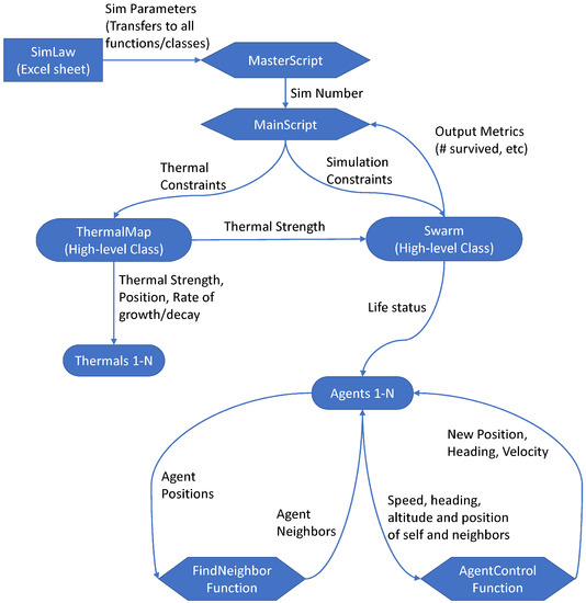 While the simulation models and implementations will soon be discussed more deeply, a high-level description of the program would explain that the master script loads in all specified parameters and generates unique parameter combinations to be simulated by a main script. Each main script manages its own thermals and agents, which are both managed by the high-level classes ThermalMap and Swarm, respectively. Each agent calculates its local neighbors and its next state using its current state, the thermal strength at its position, and the states of its neighbors. When all agents die or the simulation reaches its maximum duration, the main script will return its simulation results to the master script to be consolidated and saved for future analyses.