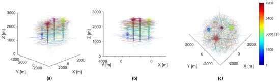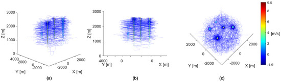 Paths of all 40 agents in a simulation. Each individual agent’s path was colored by vertical speed in meters per second, shown by the color-bar on the right side. All panels show different perspectives of the same data. (a) The paths rendered from an upper-corner perspective. (b) The paths rendered from a side-corner perspective. (c) The paths rendered from a top-down perspective.