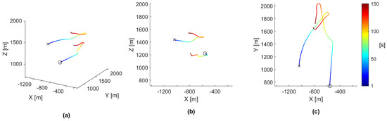 Paths of agents 19 and 30 as they work together to find and exploit a thermal updraft. Agent 19 is marked with an ‘x’ and agent 30 is marked with an ‘o’. Each individual agent’s path was colored by time from start to finish measured in seconds, as shown by the color-bar on the right side. The rendered path data only covers the first 150 s of the simulation. All panels show different perspectives of the same data. (a) The paths rendered from an upper-corner perspective. (b) The paths rendered from a side perspective. (c) The paths rendered from a top-down perspective.