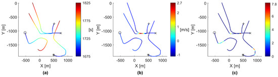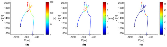 Paths of agents 9, 11, 27, and 29, as they fail to effectively discover a thermal updraft, viewed from a top-down perspective. Agent 9 is marked with an ‘x’, agent 11 with an ‘o’, agent 27 with an ‘*’, and agent 29 with a ‘+’. The rendered path data starts at 1675 s and continues until 1825 s. (a) The paths colored by time in seconds. (b) The paths colored by vertical velocity in meters per second. (c) The paths colored by cohesion magnitude to surrounding agents.