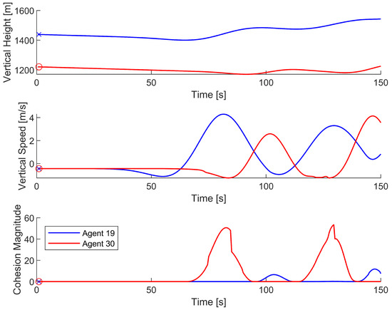 Vertical position, vertical speed, and cohesion magnitude data of agents 19 and 30 as they attempt to find and exploit a thermal updraft. Agent 19 is represented by the blue line and is marked with an ‘x’, while agent 30 is represented by the red line and marked with an ‘o’. The data only covers the first 150 s of the simulation.
