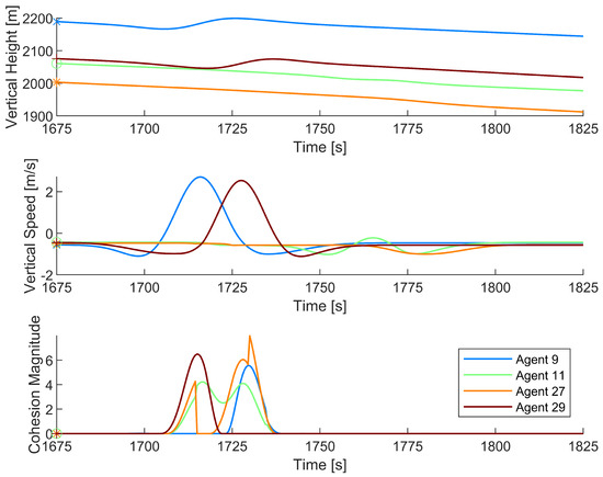 Vertical position, vertical speed, and cohesion magnitude data of agents 9, 11, 27, and 29, as they fail to effectively discover a thermal updraft. Agent 9 is marked with an ‘x’, agent 11 with an ‘o’, agent 27 with an ‘*’, and agent 29 with a ‘+’. The rendered path data starts at 1675 s and continues until 1825 s.