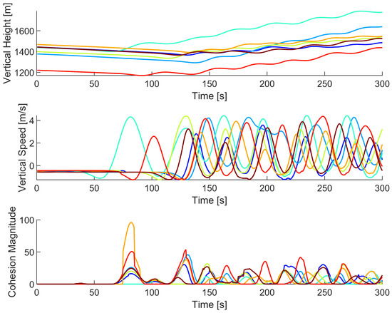 Vertical position, vertical speed, and cohesion magnitude data of a group of agents as they discover and exploit a thermal updraft. The included agents are agents 7, 13, 19, 21, 28, 30, and 36, chosen due to their close proximity and exploitation of the chosen thermal updraft. The data only covers the first 300 s of the simulation.