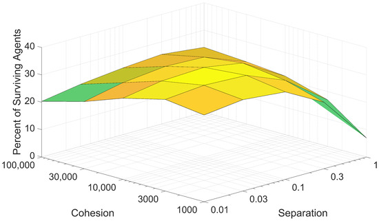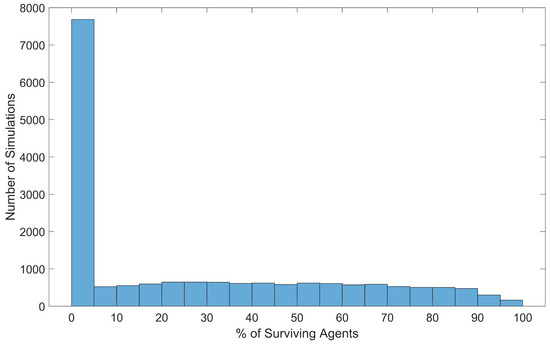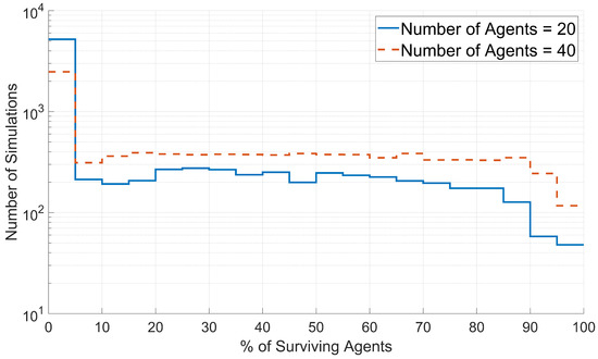 The primary output metric used for swarm performance evaluation was the percentage of agents that survived the duration of the simulation, referred to as the survival percentage. The survival percentage is calculated using the number of surviving agents, N, and the initial number of agents, , expressed as: