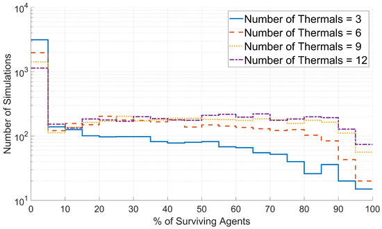 From the results of the simulations, many trends have been observed, including the effects of the swarm’s size, the number of thermal updrafts, and the migration gain. However, these trends may lose accuracy with a larger sample of variable values. For instance, while swarms with 40 agents had better survival rates than swarms with 20 agents, there may be an upper limit to the number of agents that can be supported by a given swarm or by a given environment. Further simulations may seek to explore the effects of input parameters with a higher range and resolution.