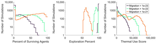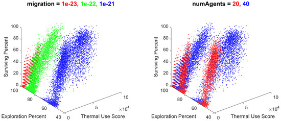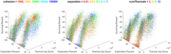 The gradient appearing from cohesion expresses that as cohesion increases, the swarm’s thermal use also increases, with minimal impact on the swarm’s exploration or survival. The gradient appearing from separation expresses that as separation increases, the swarm’s exploration also increases, with minimal impact on the swarm’s thermal use or survival. The gradient appearing from the number of thermals expresses that as the number of thermals increases, the swarm’s thermal use and survival increases, with minimal impact on the exploration. The utility of these trends provides minor control of the swarm’s performance in these metrics, within a given combination of migration and the initial number of agents.