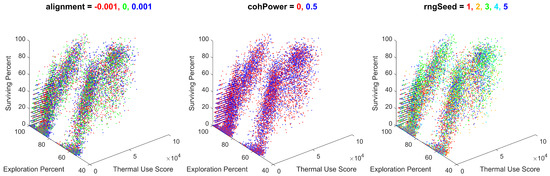 All batch simulation data plotted for thermal use, exploration percentage, and survival percentage, colored for alignment values of −0.001 and 0, 0.001, cohesion power values of 0 and 0.5, and random number generator seeds of 1, 2, 3, 4, or 5. Note the lack of any identifiable trend between the results and each unique value for the alignment, cohesion power, and RNG seed.