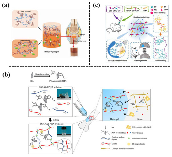 (a) Illustrative diagram for the preparation of a mussel-inspired GelMA hydrogel with in situ mineralization of nano-hydroxyapatite to repair osteochondral defects [48]. (b) Incorporation of PDA-modified hydroxyapatite nanoparticles (PHA NPs) into an oxidized sodium alginate/gelatin hybrid hydrogel for bone regeneration [49]. (c) Preparation of mussel-inspired bisphosphonated injectable nanocomposite hydrogels with adhesive, self-healing, and osteogenic properties [50].