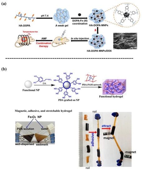 Iron oxide MNPs are classified as magnetic materials, and are generally embedded within a polymer network to achieve magnetic-based nanocomposite hydrogels that can remotely respond to external magnetic fields and can be used for biosensing, diagnostic, and actuators applications [96,97,98,99]. However, iron oxide MNPs have limited interactions with polymer chains, which requires surface modification prior to fabricating the hydrogel. The surface chemistry based on the coordination of catechol-Fe(III) is one crucial strategy for the synthesis of magnetic-based nanocomposite hydrogels. For instance, Dai et al. [51] reported a catechol-Fe(III) coordination hydrogel composed of dopamine-conjugated hyaluronic acid (HA-DOPA) and iron oxide MNPs (Figure 2a). The MNPs in the hydrogel not only served as a structural crosslinking agent to enhance the hydrogel, but also a magnetothermal conversion agent for on demand release of doxorubicin (DOX). Consequently, the HA-DOPA-MNPs/DOX hydrogel exhibited anticancer effects through the combined release of DOX and induction of hyperthermia in the tumor cells. In our previous study [52], we designed a magnetic hydrogel with a high flexibility, self-healing ability, and tissue adhesiveness by incorporating PDA-grafted-Fe3O4 NPs into a PAM hydrogel (Figure 2b). In short, the iron oxide MNPs-loaded hydrogels will generate magnetic responses and heat for drug release when they are exposed to an external magnetic field.