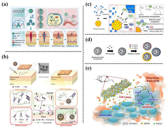 (a) Schematic of preparing a PVA entangled porous nanoadhesive system of PDA/silica with an ROS scavenging/angiogenesis ability for efficient skin wound closure [53]. (b) Schematic of adhesive hydrogel patch consisting of PAM/PDA hydrogels embedded with extra-large pore mesoporous silica nanoparticles (XL-MSNs) [54]. (c) Fabrication of a catechol-containing polyethylene glycol-based adhesive (PEG-DA) formulated with silica NPs to control the released amount of H2O2 [55]. (d) Fabrication of PDA-coated mesoporous silica NPs that can be stably incorporated within macroporous μRB scaffolds to allow the tunable release of transforming growth factor (TGF-β3) [56]. (e) Schematic illustration of combination therapy based on hierarchical PGH@MGPA composite fibers [57].