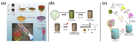 (a) Schematics of assembling polydopamine (PDA)-hybridized ZIF-8 (pZIF-8 nanoMOFs) with PDA-modified hydroxyapatite NPs (pHA NPs) on a 3D printed gelatin scaffold, with dual functions of anticancer and bone formation capabilities [58]. (b) Preparation of a ZIF-8@PCNF composite hydrogel for on-demand drug release by responding to pH and NIR light irradiation [59]. (c) Fabrication of a PDA@ZIF-8/CNFs composite hydrogel and its drug delivery behavior upon NIR light irradiation or under pH variation [60].