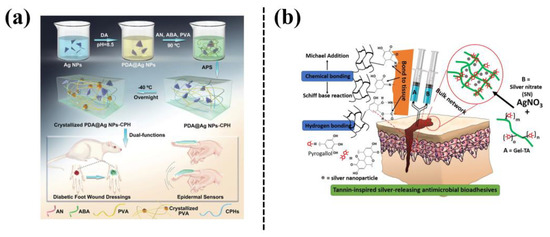 (a) Synthesis of a PDA@Ag NPs-CPH hydrogel and its applications as an epidermal sensor and diabetic-foot-wound dressing [61]. (b) Tannin-inspired antimicrobial bioadhesives crosslinked by silver nitrate (SN) [62].
