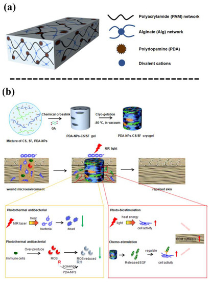 (a) Incorporating PDA-NPs into a dual-network of PAM and alginate to form underwater adhesive PAM-Alg-PDA hydrogel [65]. (b) Schematics of mussel-inspired PDA-chitosan-silk fibroin cryogel as a photothermal patch for promoting wound regeneration [66].