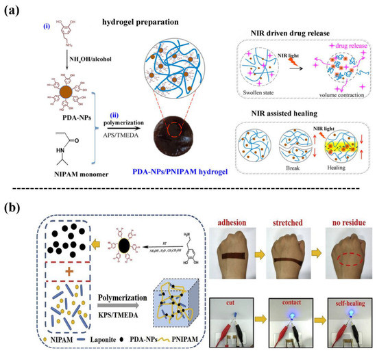 (a) Incorporating PDA-NPs into a PNIPAM hydrogel to fabricate a PDA-NPs/PNIPAM hydrogel with NIR responsiveness, self-healing, on-demand drug releasing, and adhesive properties [67]. (b) Fabrication of a PDA-NPs and laponite-embedded nanocomposite hydrogel with stretchability, conductivity, dual light- and thermo-responsive, and adhesive properties [68].