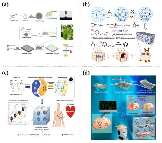 (a) A transparent, conductive, stretchable, and adhesive hydrogel was formed by in-situ formation of PDA-PPy nanofibrils in a PAM hydrogel [72]. (b) Schematic of the fabrication processes and application of the PPy-PDA/PAA hydrogels [73]. (c) Preparation of conductive and adhesive hydrogel based on hydrophilic and redox-active conductive-polymer/sulfonated lignin (CP/LS) NPs [74]. (d) A bioadhesive ultra-soft brain-machine interface (BMI) was fabricated based on integration of metallic microcircuits with a dopamine methacrylate-hybridized poly(3,4-ethylenedioxythiophene) nanoparticle (dPEDOT NP)-loaded hydrogel [75].