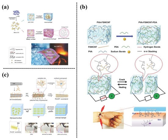 (a) Fabrication of a mussel-inspired conductive, adhesive, and anti-freezing/anti-heating hydrogel by co-polymerization of PDA-modified CNTs with AA and AM in a glycerol-water (GW) binary solvent [76]. (b) Schematic diagram of the synthesis process of a conductive, healable, and adhesive hydrogel by incorporation of a conductive PDA-functionalized SWCNTs nanotube into a dynamic supramolecular crosslinked PVA hydrogel, which can be adhered on the wrist for healthcare monitoring [77]. (c) Schematic of preparation of an anisotropic hydrogel based on a mussel-inspired conductive ferrofluid comprised of PDA-mediated conductive and magnetic Fe3O4-CNT nanohybrid (PFeCNT). Demonstration of the anisotropic hydrogel simultaneously possessing conductive, magnetic, and self-adhesive properties [78].