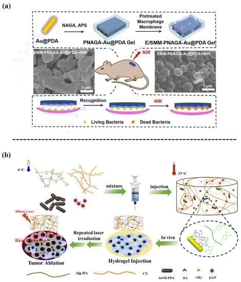 (a) Fabrication of nanocomposite antibacterial hydrogel with high strength and toughness by one-pot polymerization of N-acryloyl glycinamide (NAGA) mixed with polydopamine-coated gold nanorods (Au@PDA NRs) [79]. (b) Preparation of thermosensitive CGP/Alg-DA/AuNR hydrogels with photothermal activity for tumor therapy [80].