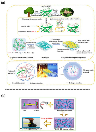 (a) Design strategy of a multifunctional hydrogel by co-polymerizing acrylic acid (AA), polyvinyl alcohol (PVA), and silver /TA-CNF in a glycerol-water binary solvent [81]. (b) Preparation of a PC-CNF-GG-glycerol hydrogel [82].