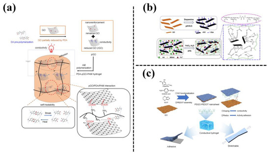 (a) Preparation of a conductive, self-adhesive, and self-healable hydrogel by introducing PDA-partially-reduced GO (pGO) nanosheets into a PAM hydrogel [86]. (b) Incorporating pGO into a PAA network to form a mussel-inspired conductive nanocomposite hydrogels [87]. (c) Fabrication of the hydrophilic, conductive, and redox-active sandwich-like PSGO-PEDOT nanosheet and its incorporation into a PAM network to form a hydrogel with high conductivity, adhesiveness, and stretchability [88].