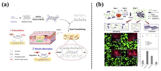 (a) Preparation of a dual-crosslinked pGO-CS/SF scaffold for repairing skin wound defects [109]. (b) Schematic of preparation of a CS-DA-GO composite hydrogel. Primary cardiomyocytes derived from human embryonic stem cells were seeded onto CS-DA-GO composite hydrogels to evaluate the biocompatibility of the hydrogels for cardiac tissue engineering [110].