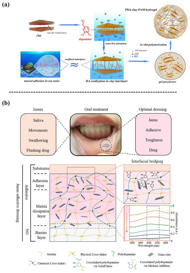 (a) Design strategy for the preparation of a mussel-inspired adhesive polydopamine-clay-polyacrylamide (PDA-clay-PAM) hydrogel by the confined oxidation of dopamine [89]. (b) Fabrication of a mussel-inspired Janus mucosal dressing with a tough and adhesive hydrogel composed of gelatin, polydopamine, and nano-clay to achieve drug release [90].