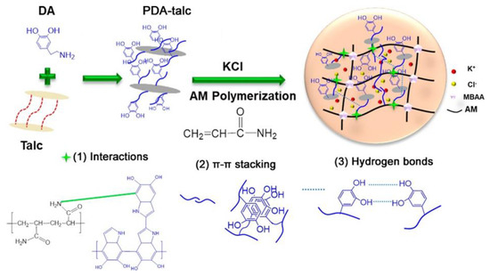 Schematic of the fabrication process of the DA-talc-PAM hydrogel [91].