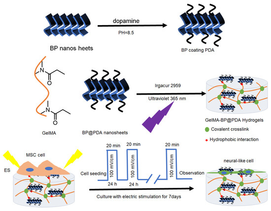 Schematics of GelMA-BP@PDA hydrogels. The surface modification of BP nanosheets by PDA. Incorporation of the PDA-BP (BP@PDA) nanosheets into a GelMA network. Schematic of regulating the growth and differentiation of MSCs by conductive GelMA-BP@PDA hydrogel under external electrical stimulation [92].