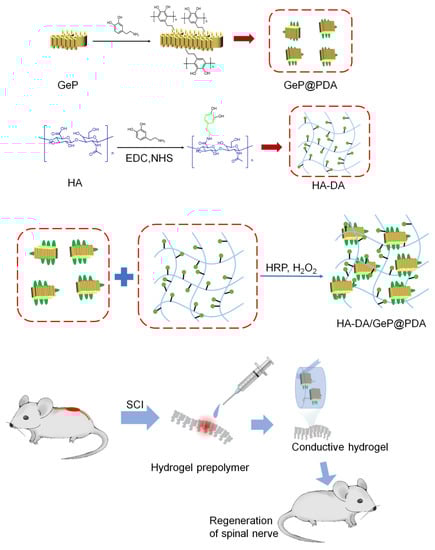 Preparation of GeP@PDA nanosheets, HA-DA polymers, and HA-DA/GeP@PDA conductive hydrogels. Application of the injectable and conductive HA-DA/GeP@PDA hydrogel for spinal cord injury repair [93].