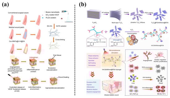 (a) Preparation of a MNFs@V-H@DA hydrogel, and wound healing process treated by the MNFs@V-H@DA hydrogel [94]. (b) Fabrication of HA-DA/MXene@PDA hydrogel and its therapeutic effects on infected diabetic wound healing, including supplying O2, scavenging ROS, eradicating bacteria, and inhibiting inflammation [95].