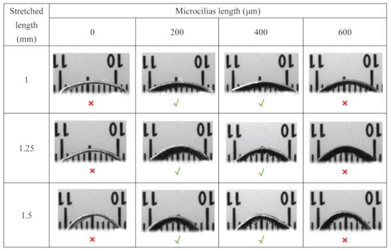 12], which serves as a reference for the length-to-width ratio selection. Hence, the robot with a length-width ratio of 10/5 is chosen to provide a feasible platform for analyzing the two other important parameters, i.e., stretched length and the length of micropillars.