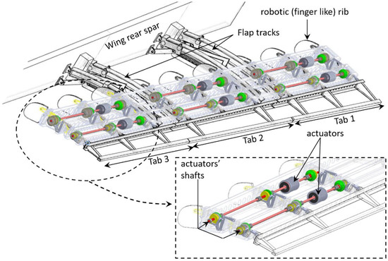 Within the framework of the Clean Sky 2 REG IADP, the design of a fault-tolerant adaptive winglet concept was addressed to enhance the wing’s aerodynamic performance in off-design conditions and reduce maneuver loads of a turboprop regional aircraft. The integrated design of the adaptive winglet is detailed in [32,33,34]. The adaptive winglet incorporates two “finger-like” mechanisms, shown in Figure 5, allowing shape adaptation of two movable surfaces (upper and lower tabs), each controlled by an independent electromechanical chain, and embedded into its main body [27,35,36]. The concept was based on the following, general assumptions: