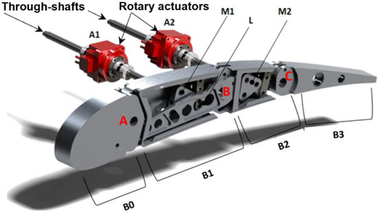 Each flap rib consists of four consecutive blocks (B0, B1, B2, and B3) hinged along the camber line at the positions marked by points A, B, and C in Figure 2. Block B0 and B2 are further connected through a link, denoted with L in Figure 2, which makes B0, B1, and B2 to move as a single degree-of-freedom mechanism. The last block, B3, is connected to block B2 only. Two rotary electromechanical actuators (A1, A2, in Figure 2) are adopted to morph the rib; the first actuator (A1) drives the motion of the first three blocks, while the second actuator (A2) controls the rotation of the last block around the hinge C. The torque of each actuator is duly amplified by optimized mechanisms (M1 and M2, in Figure 2) fully integrated in the robotic rib.