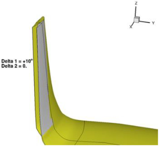 The aerodynamic design of the adaptive winglet was evaluated by CFD simulations. A significant increase in LoD, estimated on the order of 2.5%, was obtained at high CL (climb conditions) with respect to the optimal passive winglet counterpart designed for the same aircraft. On the other hand, a limited aerodynamic benefit was observed for small positive deflections at cruise conditions, being this condition one of the design flights point of the wing. Figure 7 shows an example of morphing winglet tabs deflection of 10 deg.
