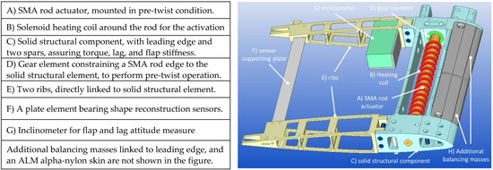 The SMA blade twist concept was developed within the Project “Shape Adaptive Blades for Rotorcraft Efficiency” (SABRE) [29], under the H2020 framework. CIRA developed a morphing system that was able to change the blade twist in compliance with the targets of the Project: the elaboration of adaptive technologies affecting the main rotor features to improve the helicopter performance. The core of the architecture consists of a compact and solid shape memory alloy (SMA) rod, used as torque/twist actuator, [39,40]. Embedded along the span, and connecting two cross-sections, such a driving device is activated by a thermal field, generated by a heating coil wrapped around the SMA and enforcing the phase transformation from martensite to austenite, with the macroscopic effect of recovering a pre-imposed deformation. In Figure 9, the main parts of the architecture are shown.