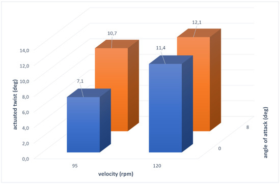 A three-bay blade segment is shown in Figure 11. In line with the scope of SABRE and with the target of assessing the TRL of the concept, a specific experimental path was followed to demonstrate the actual capability of the manufactured system to produce the prescribed twist in representative environments. In detail, three different test campaigns were carried out. Laboratory tests were conducted to characterize the system early by simulating two reference configurations: fixed and rotary wing, respectively. In the first one, the blade demonstrator was installed in a clamped-pinned layout, so to allow the twist, while supporting both the ends of the system. In the second one, the blade demonstrator was camped at one edge, while an axial load was applied on the other side, replicating centrifugal loads occurring during rotation. In both the cases, hanged weights simulated the effect of inertia and aerodynamic forces. Twist produced by the SMA actuators was measured, with and without external loads. One or more bays were activated. To achieve deformed geometry reconstruction, morphed shape was related to the deformation field, retrieved by strain gages and fiber optics. The tests proved the capability of the system to produce the desired twist while withstanding the most severe load conditions with respect to the envisaged tests in wind tunnel (WT) and whirl tower (WHT). In fact, the single bay achieved twist angles of 0.68 and 0.55 deg for fixed and rotary configurations respectively that, scaled over the entire blade radius of 5 m, correspond to 15.3 and 12.4 deg, well higher than the requirement of a twist of 8 deg. WT tests aimed at measuring the aerodynamic performance in the unmorphed and morphed configurations, respectively, by activating progressively all the bays along the span. The blade was mounted in clamped-pinned configuration. Tests were run within the established angle of attack operation range [-11; +11] and at velocities of 95 and 120 rpm. Those tests confirmed the system capability in enhancing the aerodynamic performance. WHT tests targeted to evaluate the influence of the centrifugal forces on the production of the desired twist. In that case, the blade segment was simply clamped on one side and tested at different angles of attack, at the maximum speed compatible with the facility safety requirements. Even when turning at high speed, the morphing system proved to be capable of producing the required twist, therefore overcoming the potential obstacles linked to an increase of friction forces, structural stiffness, and the insurgence of certain architectural distortions. As shown in the bar plot of Figure 12 representing the actuated twist at the tip, scaled to a 5 m spanned blade, the morphing system produces the highest twist of 12.1 deg for the maximum AoA and velocity and a twist of 7.1 deg for the minimum velocity and at 0 AoA, slightly lower than the requirement (8 deg). In addition to that, the mass distribution together with the specific aerodynamic loads generated along the span, favor the twist transmission with the speed and the incidence.