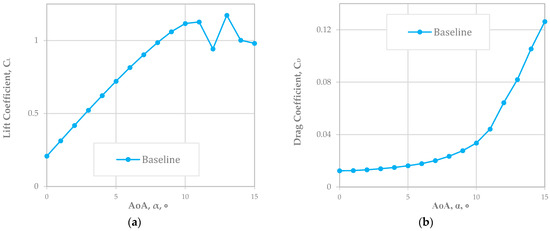 Figure 2 below shows the case of NACA 2410 with the baseline of the and varying the AoA by up to 15°. As noted, both the and increased as the AoA increased, and the stall angle was around 11°. The operational condition was Re at 778,179 for the RQ-7a Shadow. Through this, we confirmed the that computational models were sufficiently accurate to run other cases and that the and were reliable compared to the benchmark data [72,73,77].