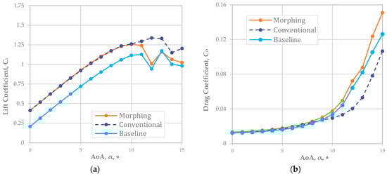 For NACA 6410, Figure 4a shows the was well matched for both the conventional and morphing wings. The offset value of about 0.5 in implied that the NACA 6410 had a 0.5 greater than NACA 2410 (or a 4% higher camber rate was around a 0.5 increment). Based on the graph in Figure 4a, the reliable AoA was up to 10° because the airfoil began to stall after 10°. As shown in Figure 4b, we analyzed ; the results implied that a camber morphing wing at a 6% camber rate (NACA 6410) had an almost identical to that of the conventional fixed wing. However, the graph began to separate at an AoA of around 5° when the of the camber morphing wing was less than that of the fixed wing.