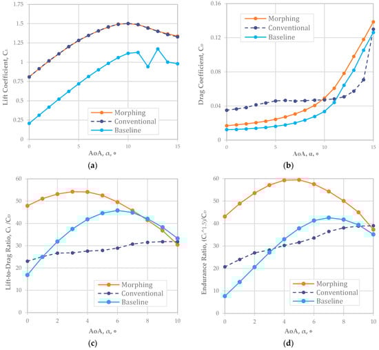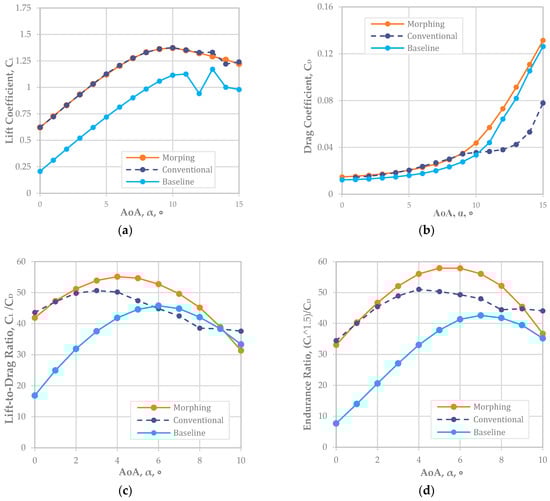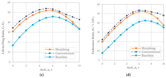 Matching morphing (NACA 6410) and conventional airfoil plots (Re = 778,179): (a); (b); (c); (d) endurance ratio.