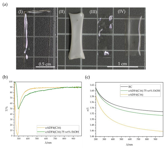(a) Appearance of eADF4(C16) films (I) without post-treatment and post-treated with (II) 80 wt% EtOH, (III) 75 wt% EtOH and (IV) 70 wt% EtOH with a respective film thickness of 85 µm. (b) Transmission spectra of eADF4(C16) films, untreated and post-treated with 75 wt% EtOH. (c) Refractive index progression of RC, as well as untreated and post-treated eADF4(C16).